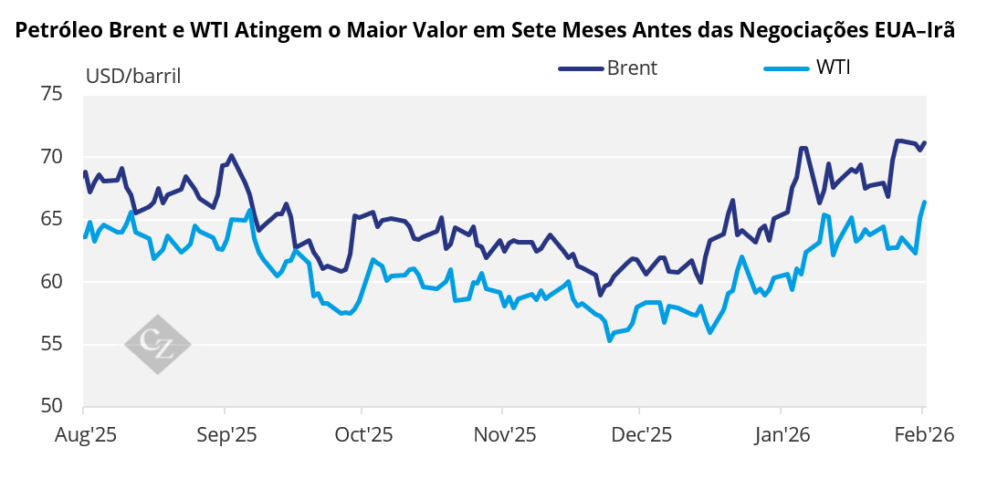 Negociações EUA–Irã Impulsionam Preços do Petróleo: O petróleo atingiu o maior valor em sete meses, antes das negociações de quinta-feira em Genebra entre os EUA e o Irã, com as tensões sobre os programas nucleares e de mísseis alimentando preocupações com a oferta. O petróleo Brent atingiu USD 71,10 e o petróleo WTI, USD 65,84, enquanto as discussões sobre armas entre Irã e China e o aumento dos estoques de petróleo bruto dos EUA adicionaram ainda mais incerteza ao mercado.