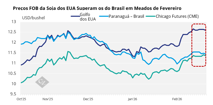 Em fevereiro, houve uma grande reviravolta nas tarifas dos EUA. A Suprema Corte derrubou as tarifas emergenciais do presidente Trump, o que levou à imposição de uma taxa de importação temporária de 10%, que deverá subir para 15%, aplicada a todos os parceiros comerciais e reequilibrando as vantagens comerciais. China, Brasil e Índia se beneficiarão com tarifas relativamente menores, enquanto aliados dos EUA, como a União Europeia e o Reino Unido, enfrentarão tarifas mais altas. O clima de inverno, o aumento dos custos dos fertilizantes e os novos acordos comerciais com a Coreia do Sul, o Brasil e a Indonésia aumentam ainda mais a pressão sobre os mercados agrícolas globais.