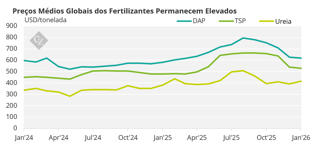 Analistas alertam que os preços dos fertilizantes continuam sendo a principal ameaça à rentabilidade agrícola em 2026, com o uso de fosfato na América do Norte caindo 20% no outono de 2025 e incerteza quanto à demanda na primavera. Apesar das reduções, a área de plantio do milho nos EUA (93–95 milhões de acres) mantém a demanda alta — especialmente por nitrogênio.