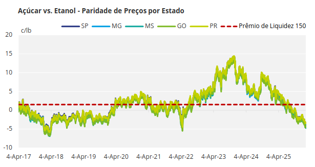 Estamos monitorando de perto a paridade em todos os estados do CS Brasil. Usinas em estados fronteiriços como Mato Grosso do Sul e Goiás foram as primeiras a responder à queda nos preços do açúcar, rapidamente redirecionando a produção para o etanol. Com o início da nova safra em abril, a flexibilidade de produção provavelmente aumentará ainda mais, exigindo um acompanhamento contínuo das decisões sobre o mix de açúcar.