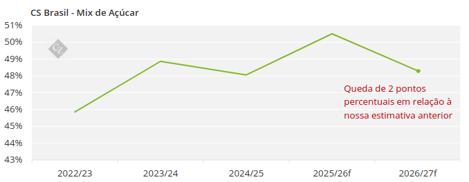 Na semana passada, revisamos nossas estimativas para a safra de 2026/27 no Centro-Sul. Considerando os baixos níveis de preços até o momento, esperamos uma safra mais dinâmica em termos de decisões de produção por parte das usinas. Como resultado, reduzimos nossa previsão para o mix de açúcar para 48,3%.