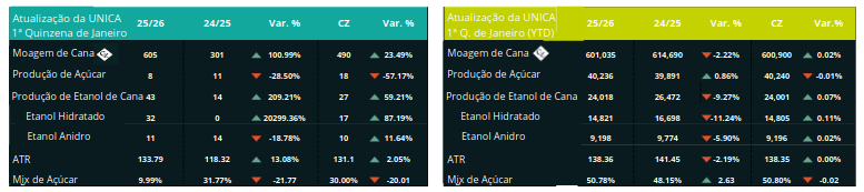 A UNICA divulgou hoje os dados mais recentes referentes à primeira quinzena de janeiro da safra 2025/26.