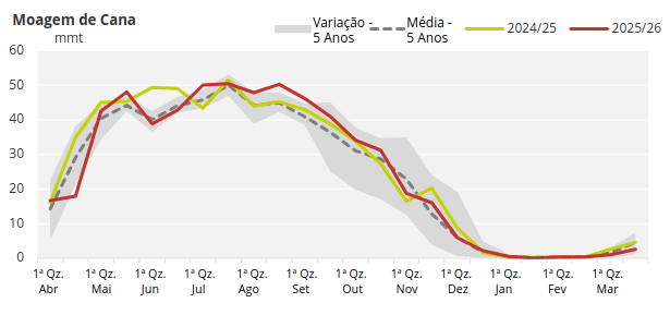 Com apenas 9 unidades de processamento de cana-de-açúcar ainda em operação, o Centro-Sul do Brasil encontra-se agora na entressafra. As usinas devem retomar as atividades somente no final de março, marcando o início da safra 2026/27.