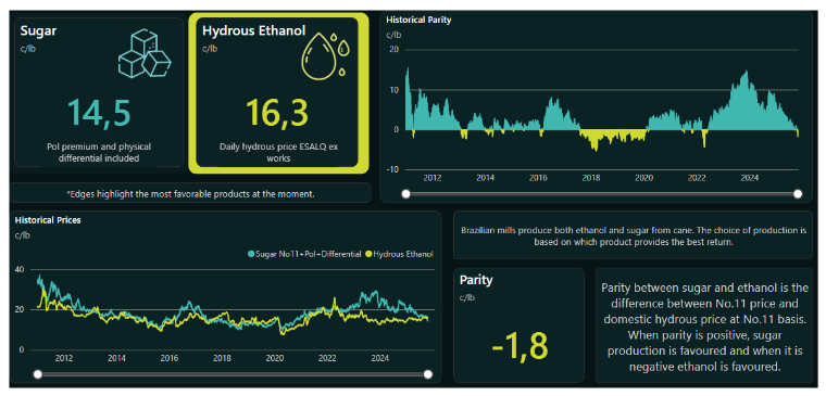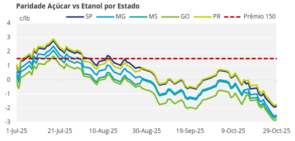 Nas últimas atualizações, já era possível observar uma redução gradual no valor do mix de açúcar, impulsionada principalmente pelas usinas de Mato Grosso do Sul, Goiás e parte de Minas Gerais, onde a distância dos portos tornava o etanol uma alternativa mais atrativa.