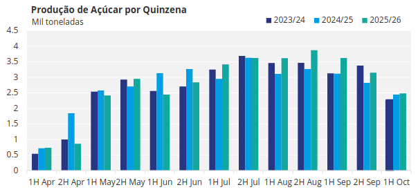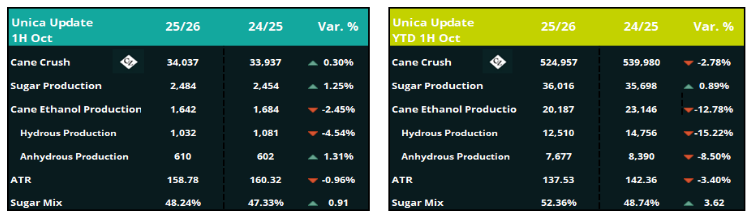 A UNICA divulgou hoje a atualização referente à 1ª quinzena de outubro. Os dados indicam um maior direcionamento das usinas para a produção de etanol, em resposta à queda nos preços do açúcar. Ainda assim, a produção total permanece em linha com o projetado, sustentada pelo maior volume de cana processada e pela recuperação do ATR.