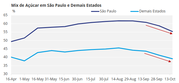 No entanto, com a constante queda dos preços internacionais, usinas de São Paulo e Paraná também passaram a direcionar a produção para um mix mais alcooleiro, intensificando o movimento de queda. Entre as duas últimas quinzenas, o mix do estado de São Paulo recuou 3 pontos percentuais, passando de 58,67% para 55,30%.