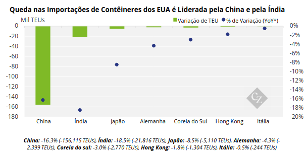 Entre as quedas, a China e a Índia lideraram, com outras fontes importantes — incluindo Japão, Alemanha, Coreia do Sul, Hong Kong e Itália — também apresentando quedas modestas.
