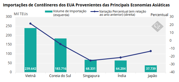 Em outubro, o desempenho das importações dos EUA entre as principais economias asiáticas foi misto. As importações do Vietnã apresentaram forte crescimento, enquanto a Coreia do Sul registrou uma leve queda. As importações de Singapura, Índia e Japão caíram, com Singapura e Índia apresentando as maiores quedas.