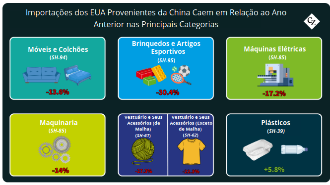 Segundo a Descartes Datamyne, as quedas em relação ao ano anterior foram amplas nas principais categorias de importação da China em outubro, com a maioria dos principais grupos de produtos registrando perdas de dois dígitos.