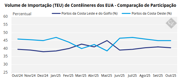 Analisando de forma mais detalhada, os portos da Costa Oeste mantiveram uma participação maior do que os portos da Costa Leste e do Golfo ao longo do ano, exceto em março e maio. A Costa Oeste começou o ano com aproximadamente 48%, caiu de forma acentuada para cerca de 40% em março e, após algumas flutuações, se estabilizou acima de 44% de junho a outubro.