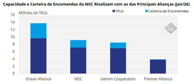 Após a dissolução da aliança dominante 2M, a MSC optou por operar como uma transportadora marítima independente. Essa decisão foi respaldada por uma expansão estratégica e agressiva de sua frota, que agora ultrapassa 7,1 milhões de TEUs. A MSC também detém a maior carteira de encomendas do setor, o que lhe permite competir diretamente com as principais alianças em termos de escala e cobertura de rede.