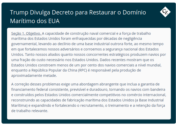 Em abril de 2025, o governo Trump anunciou um decreto executivo para “Restaurar o Domínio Marítimo dos Estados Unidos”. A iniciativa concentra-se na reconstrução do setor naval americano, no combate ao domínio da China e no fortalecimento das capacidades marítimas nacionais.