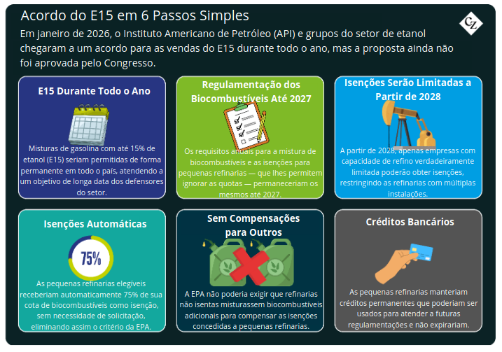 O plano de vendas do E15 durante todo o ano está paralisado no Congresso. Grupos de biocombustíveis e o setor petrolífero haviam concordado com reformas para expandir a disponibilidade do E15 e limitar as isenções para refinarias. As partes interessadas, incluindo os produtores de milho, continuam pressionando por uma legislação conjunta antes de uma possível votação em fevereiro.