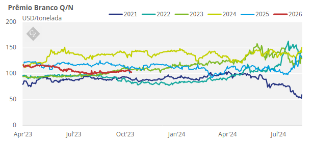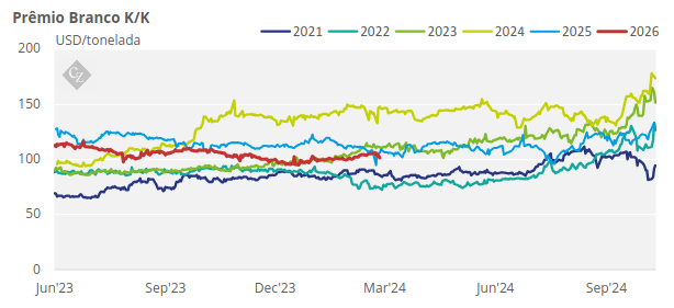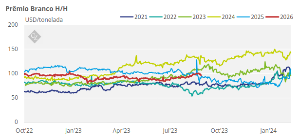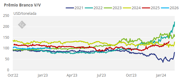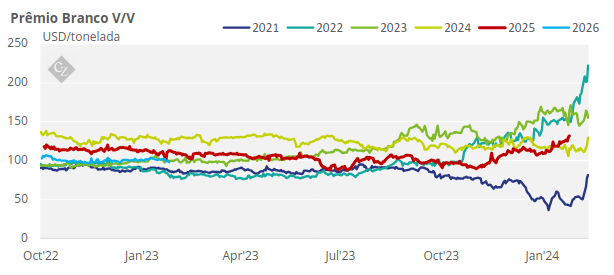 O prêmio branco V/V se fortaleceu e agora está sendo negociado em torno de USD 131/tonelada, acima dos USD 118/tonelada da semana anterior.