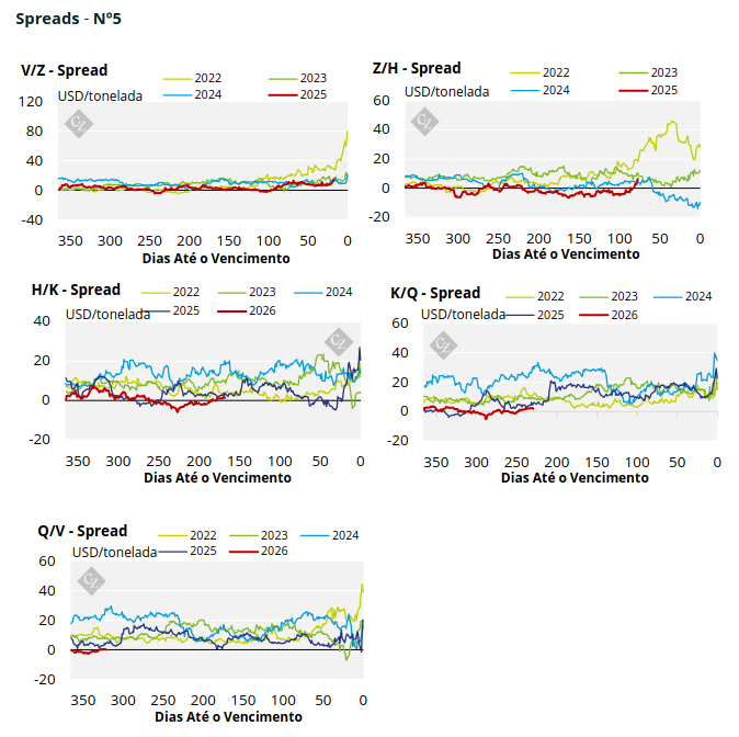 Observando a curva forward do açúcar refinado nº 5, o contrato de outubro de 25 permanece bem acima dos contratos próximos, refletindo backwardation a curto prazo.