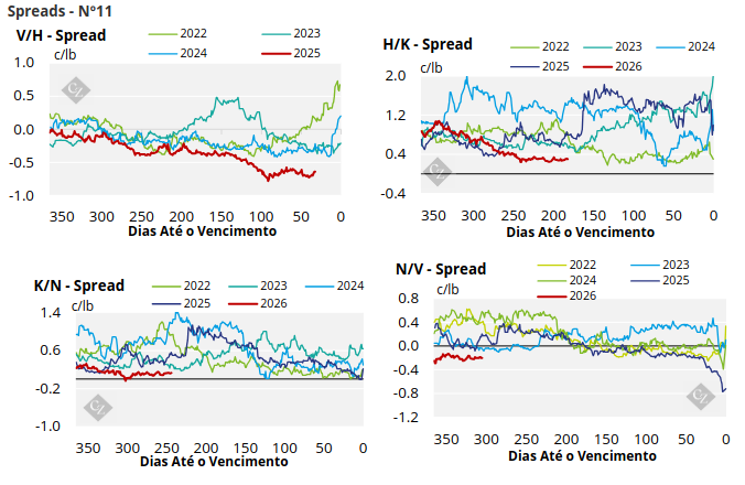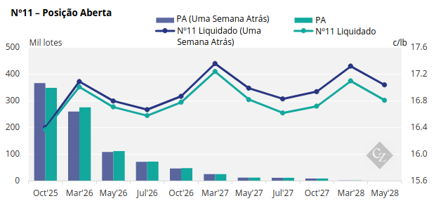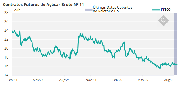 Na última semana, a curva forward do açúcar nº 11 manteve-se estável, com outubro de 2025 a 16,37c/lb. Os preços de março de 2026 a maio de 2028 permaneceram praticamente inalterados em relação à semana passada.