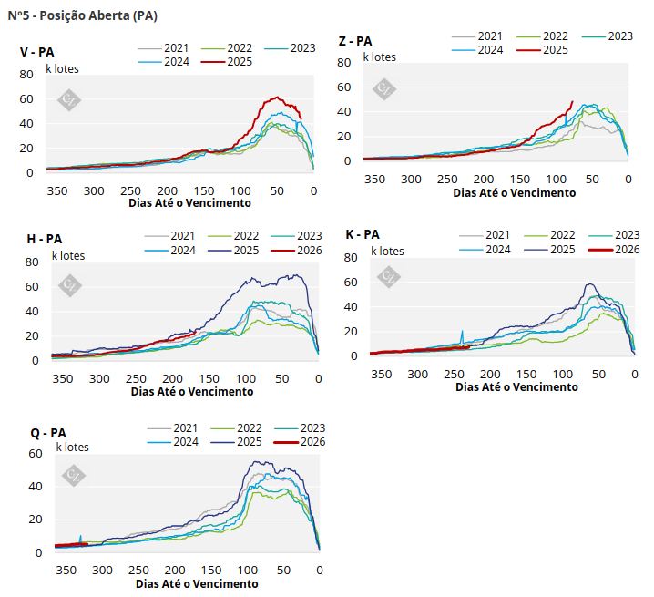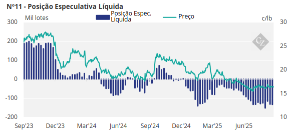 Os preços atingiram uma alta de 16,5c/lb na última terça-feira, provavelmente impulsionados pelo aumento da cobertura pelos usuários finais e pela adição de cerca de 7,8 mil lotes de posições longas. No entanto, essa força de preço provavelmente foi alcançada pela venda por parte dos produtores, que abriram 6,9 mil lotes de posições curtas na última semana.