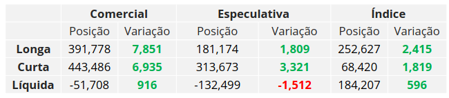 Os especuladores estiveram ativos em ambos os lados, adicionando 1,8 mil posições longas e 3,2 mil posições curtas, reduzindo sua posição líquida curta para -132.499 lotes.