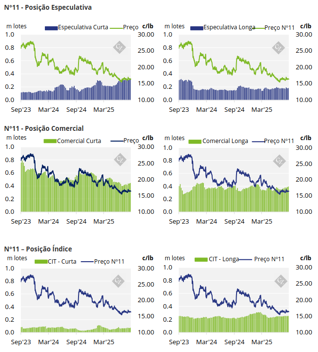 Os contratos futuros do açúcar bruto continuam sendo negociados lateralmente, mas a atividade do mercado permanece firme. Os usuários finais aumentaram suas posições pela segunda semana consecutiva, enquanto os produtores também estão precificando. A posição líquida curta dos especuladores continua crescendo, agora em -132 mil lotes.