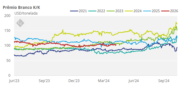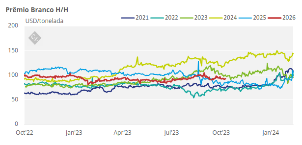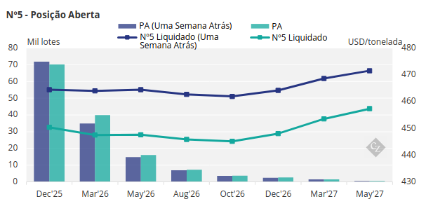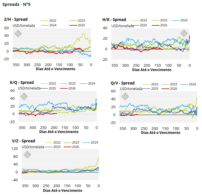 Assim como a curva forward do açúcar nº11, a curva forward do açúcar refinado nº 5 também enfraqueceu de forma geral.