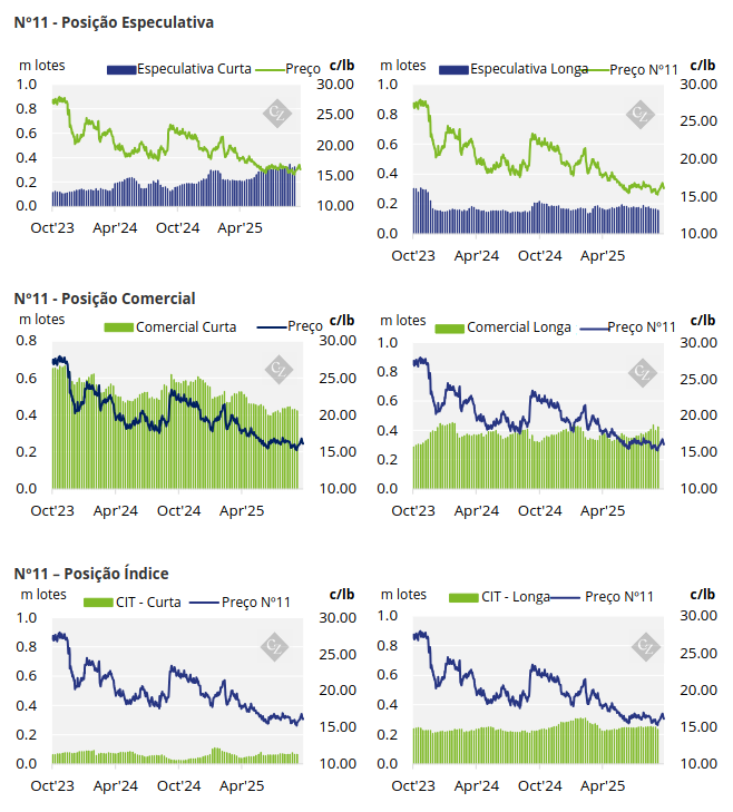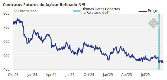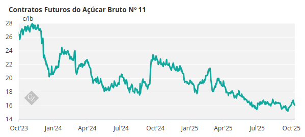 Os contratos futuros do açúcar bruto foram negociados acima de 16c/lb na semana passada, mas desde então caíram abaixo desse nível. A curva forward do açúcar nº 11 e do açúcar nº 5 caíram. Não há atualização da CFTC esta semana, devido à paralisação do governo federal dos EUA.