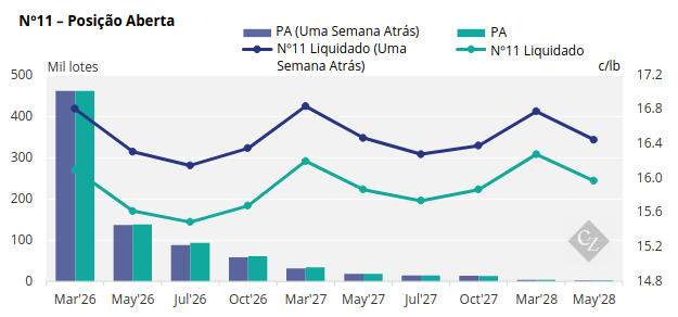 Os contratos futuros do açúcar bruto abriram a semana em uma alta de 16,8c/lb, depois caíram gradualmente na faixa de 16,6–16,3c/lb antes de fechar a semana em 16,1c/lb na sexta-feira.