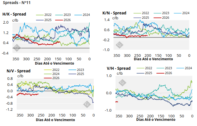 A curva forward do açúcar nº11 enfraqueceu de forma geral.