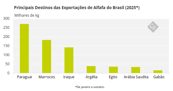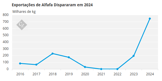 Os sistemas intensivos de produção leiteira estão impulsionando a produção de alfafa no Brasil. Esses modelos de produção exigem ração de alta qualidade, promovendo a expansão do setor de alfafa. No mercado internacional, a demanda do Oriente Médio vem crescendo devido às restrições hídricas para a agricultura e à necessidade de alimentar rebanhos em expansão.
