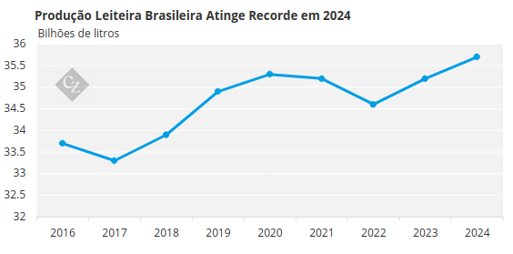 O próprio aumento na produção leiteira está impulsionando o mercado de alfafa. Em 2024, o Brasil bateu um recorde com a produção de 35,7 bilhões de litros de leite. Neste ano, espera-se um crescimento considerável de 7% a 10%, principalmente devido ao aumento da produtividade.