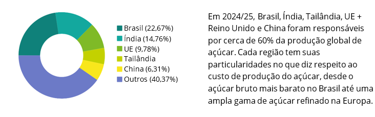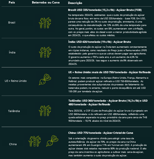 Os custos de produção do açúcar variam bastante entre os principais produtores. Os custos são mais baixos no Brasil, com USD 335/tonelada (15,2 c/lb) de açúcar bruto, enquanto, no outro extremo do espectro, Europa e China incorrem em mais de USD 750/tonelada para produzir açúcar branco. Os custos deste ano têm sido impactados por variações nos preços da beterraba e da cana, assim como por flutuações nas moedas dos produtores.