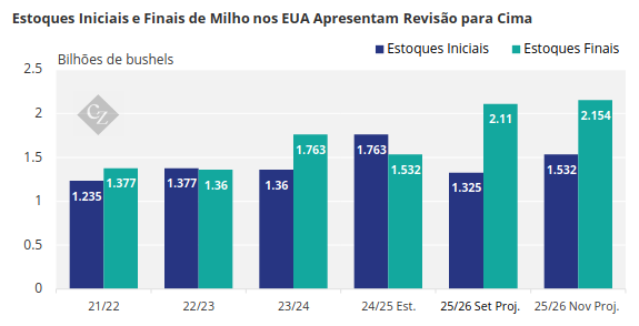 O relatório WASDE fixou a produção chinesa em 300 milhões de toneladas, superior às estimativas de 295 milhões de toneladas. A Conab, no Brasil, aumentou ligeiramente sua previsão da produção de milho para 138,8 milhões de toneladas, vs.138,6 milhões de toneladas anteriormente. Esse número se compara aos 131 milhões de toneladas previstos no relatório WASDE de novembro.