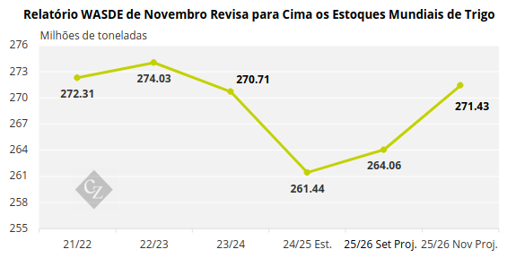 O relatório WASDE de novembro aumentou a oferta de trigo nos EUA em 57 milhões de bushels, resultado de uma produção maior, de 58 milhões de bushels. Isso devido à maior área de plantio e a um aumento de 0,6 bushels/ano na produtividade.