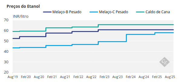 O governo aumentou recentemente o preço do etanol produzido a partir dos estoques excedentes de arroz para INR 60,32 por litro, um aumento de 3% em relação ao preço praticado nos últimos três anos. Infelizmente para o setor de açúcar, não houve alteração nos preços a serem pagos ao etanol produzido de outras matérias-primas, incluindo as derivadas da cana-de-açúcar.