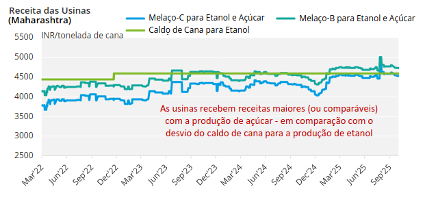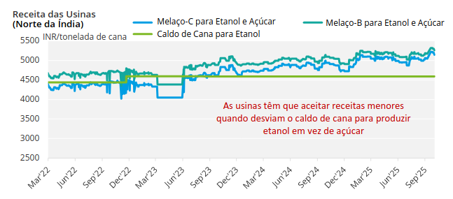 O etanol de cana-de-açúcar na Índia está perdendo participação de mercado para o etanol de grãos. Como resultado, acreditamos que o desvio da sacarose do açúcar para o etanol não excederá 3,5-4 milhões de toneladas em 2025/26. Isso é menos do que os 5 milhões de toneladas que o setor gostaria de desviar e, portanto, pode levar a um excedente na disponibilidade de açúcar em 2026.