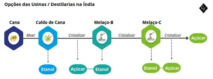 Muitas usinas/destilarias podem escolher quais matérias-primas usar para produzir açúcar ou etanol com base nos preços relativos do etanol pagos pelas empresas de comercialização de petróleo – OMCs (em inglês, Oil Marketing Companies).