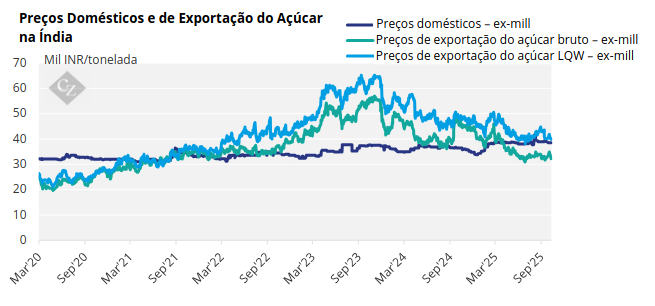 No entanto, essas margens tornaram-se menos atrativas em outubro, devido à queda dos preços internacionais. As margens estreitas explicam por que a Índia teria exportado apenas 775.000 toneladas de açúcar em 2024/25. Isso apesar do governo ter autorizado a exportação de um milhão de toneladas.