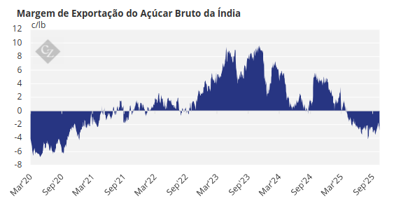 As exportações do açúcar bruto indiano requerem um preço de 18,5-19c/lb para se equiparar ao do mercado doméstico. As margens de exportação do açúcar bruto, portanto, permanecem negativas aos preços atuais, já que as usinas perderiam quase 2-3c/lb nas exportações em comparação com a venda para o mercado doméstico.