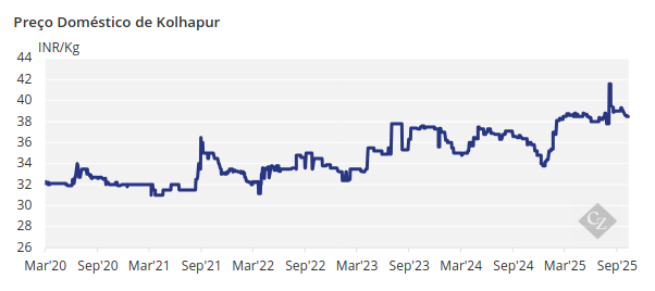 Os preços domésticos do açúcar recuaram marginalmente em outubro, sendo negociados a INR 39.000/tonelada. A rupia indiana se desvalorizou ligeiramente novamente, o que significa que perdeu cerca de 3% de seu valor em relação ao dólar americano desde julho.