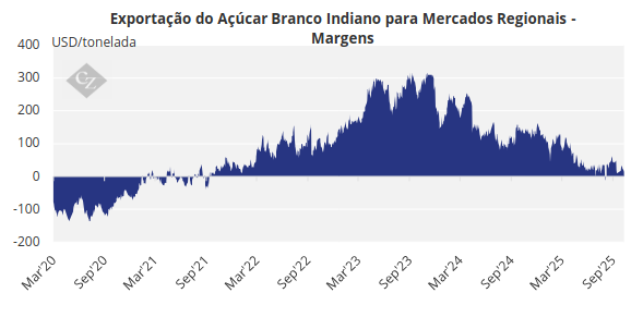 Em contrapartida, as margens de exportação do açúcar branco de baixa qualidade (LQW) para os mercados regionais têm sido positivas. Os embarques indianos se beneficiam de prêmios de frete regionais ao fornecer para esses mercados.