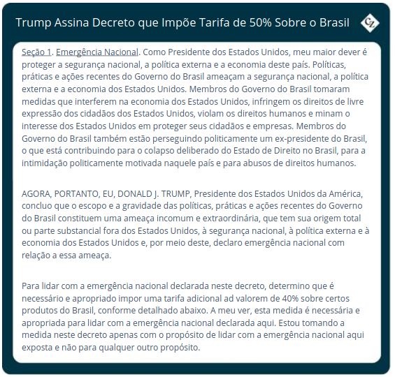 Em 30 de julho, o presidente Trump impôs uma tarifa de 50% sobre as importações brasileiras, dois dias antes do prazo proposto de 1º de agosto. O Brasil é o maior fornecedor mundial de açúcar e um dos principais fornecedores dos EUA. O presidente Trump afirmou que a tarifa foi uma retaliação contra o Brasil pelo processo contra o ex-presidente brasileiro e aliado de Trump, Jair Bolsonaro, que está atualmente em prisão domiciliar por supostamente planejar um golpe para permanecer no cargo.