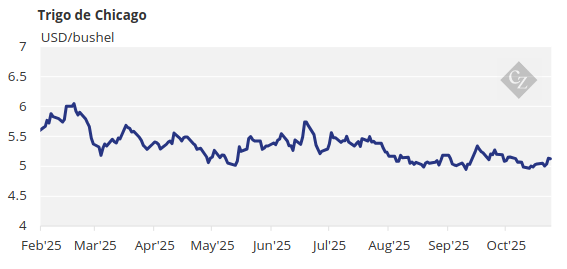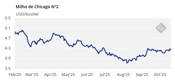 Não há alterações em nossa estimativa para o milho de Chicago, com média de USD 4,18/bushel para a safra 2025/26 (de setembro de 2025 a agosto de 2026). O preço médio desde 1º de setembro está em USD 4,17/bushel.