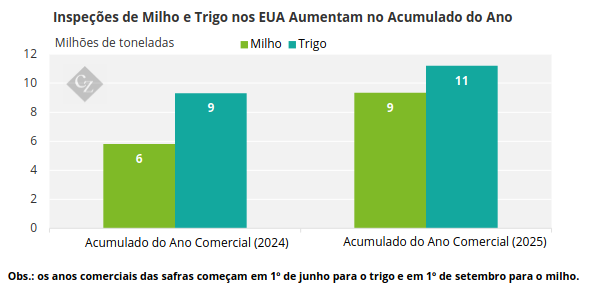 Apesar da quase inexistência de dados do USDA, alguns dados de demanda estão disponíveis. As inspeções de exportação até meados de outubro, com 368 milhões de bushels, aumentaram 61% em relação ao ano anterior, enquanto o último relatório WASDE projeta um aumento de apenas 5%.