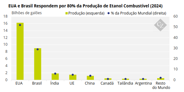 Os Estados Unidos e o Brasil são os maiores produtores de etanol do mundo. O Brasil lidera quando se trata de mistura de etanol com gasolina. Em agosto de 2025, o Brasil implementou uma regulamentação nacional que exige a mistura de 30% de etanol na gasolina. A regulamentação determina que toda a gasolina C vendida nos postos de combustível contenha 30% de etanol anidro, em vez dos 27,5% anteriores, para reduzir a dependência de combustíveis fósseis e expandir o uso doméstico de biocombustíveis.