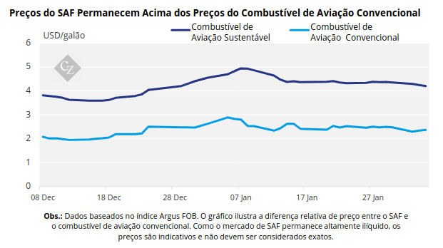 Em 2023, a Platts avaliou o SAF em base CIF no Noroeste da Europa em USD 2.286,25/tonelada, comparado a USD 741/tonelada para o combustível de aviação convencional em bases equivalentes. Embora o custo do SAF tenha diminuído desde então, ele permanece muito desproporcional em relação ao combustível de aviação padrão.