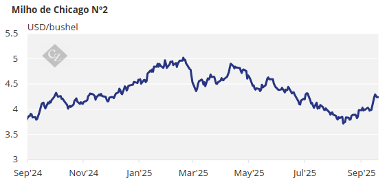 Não há alterações em nossa estimativa para o milho de Chicago, com média de USD 4,18/bushel para a safra 2025/26 (de setembro de 2025 a agosto de 2026). O preço médio desde 1º de setembro está em USD 4,10/bushel.