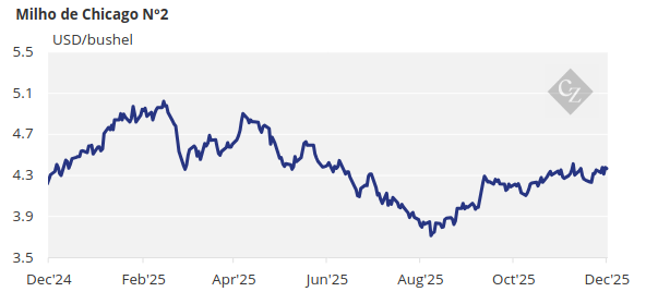 Não há alterações em nossa estimativa para o milho de Chicago, com média de USD 4,18/bushel para a safra 2025/26 (de setembro de 2025 a agosto de 2026). O preço médio desde 1º de setembro está em USD 4,25/bushel.