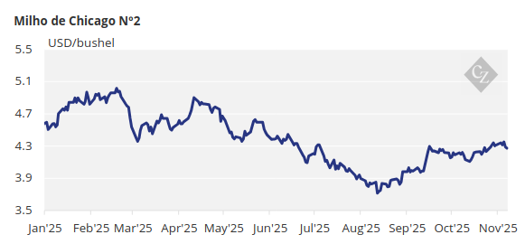 Não há alterações em nossa estimativa para o milho de Chicago, com média de USD 4,18/bushel para a safra 2025/26 (de setembro de 2025 a agosto de 2026). O preço médio desde 1º de setembro está em USD 4,20/bushel.
