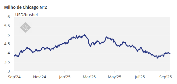 O preço médio do milho de Chicago para a safra 24/25 (de setembro de 2024 a agosto de 2025) fechou em USD 4,37/bushel. Nossa estimativa para a safra 25/26 é de que o milho de Chicago atinja a média de USD 4,18/bushel. O preço médio desde 1º de setembro está em USD 4,03/bushel.