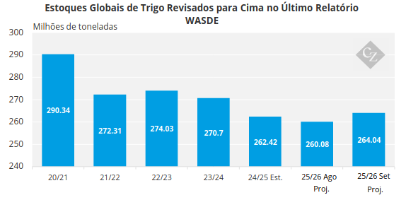 Os estoques globais de trigo aumentaram em 3,98 milhões de toneladas, com uma revisão para cima considerável, de 9,3 milhões de toneladas, na produção global. Os principais aumentos foram de 3,5 milhões de toneladas na Austrália, 1 milhão de toneladas no Canadá, 1,85 milhão de toneladas na UE, 1,5 milhão de toneladas na Rússia e 1 milhão de toneladas na Ucrânia.