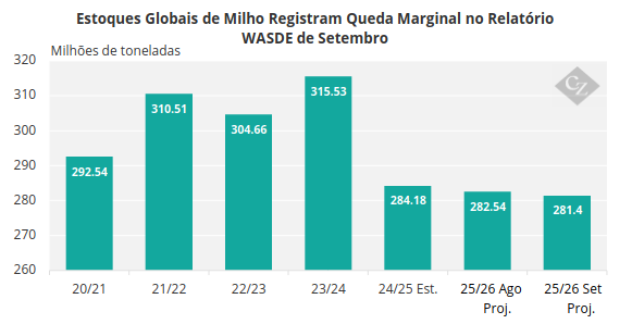O relatório WASDE de setembro aumentou os estoques finais da safra anterior de milho dos EUA em 20 milhões de bushels, devido ao menor uso de milho para etanol e à redução de 5 milhões de bushels nas importações. Para a nova safra, o USDA aumentou a produção em 72 milhões de bushels (+1,3 milhão de acres, mas -2,1 bushels/produtividade no ano). No entanto, isso foi mais do que compensado por 100 milhões de bushels de exportações a mais. Como resultado, os estoques finais da nova safra diminuíram em 7 milhões de bushels.